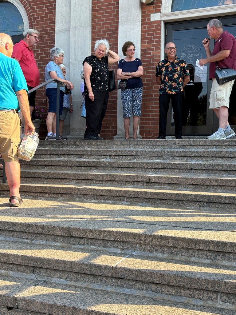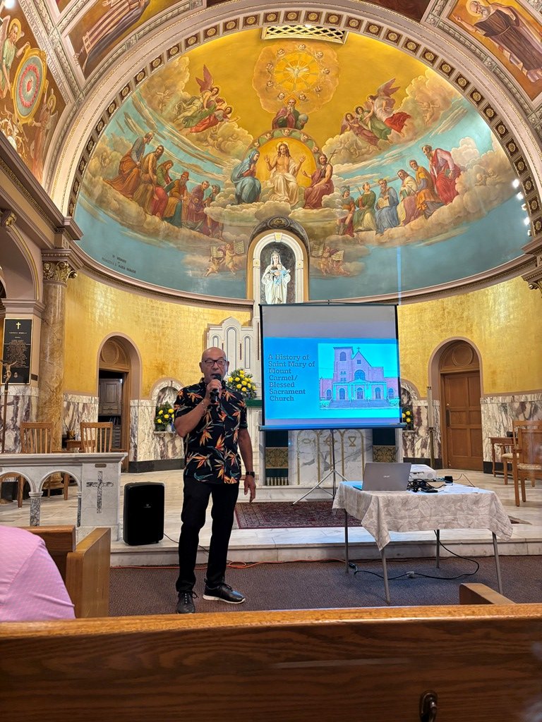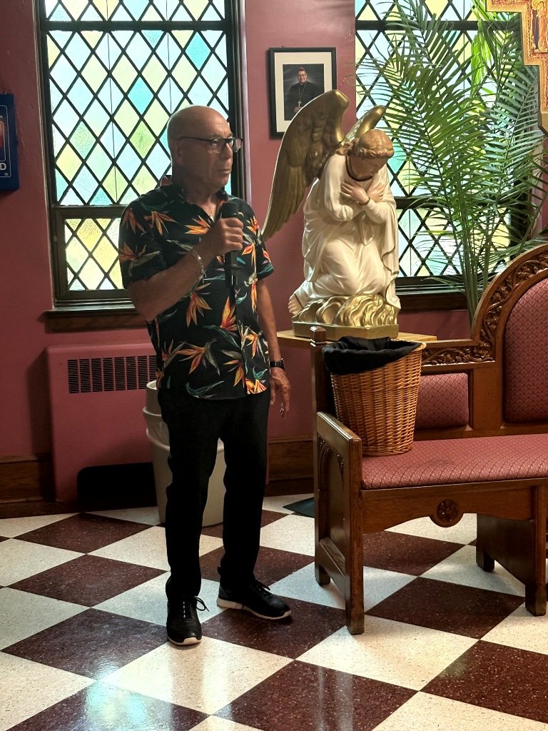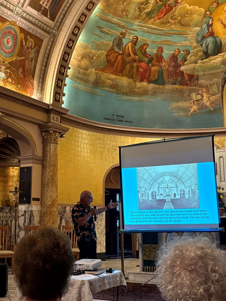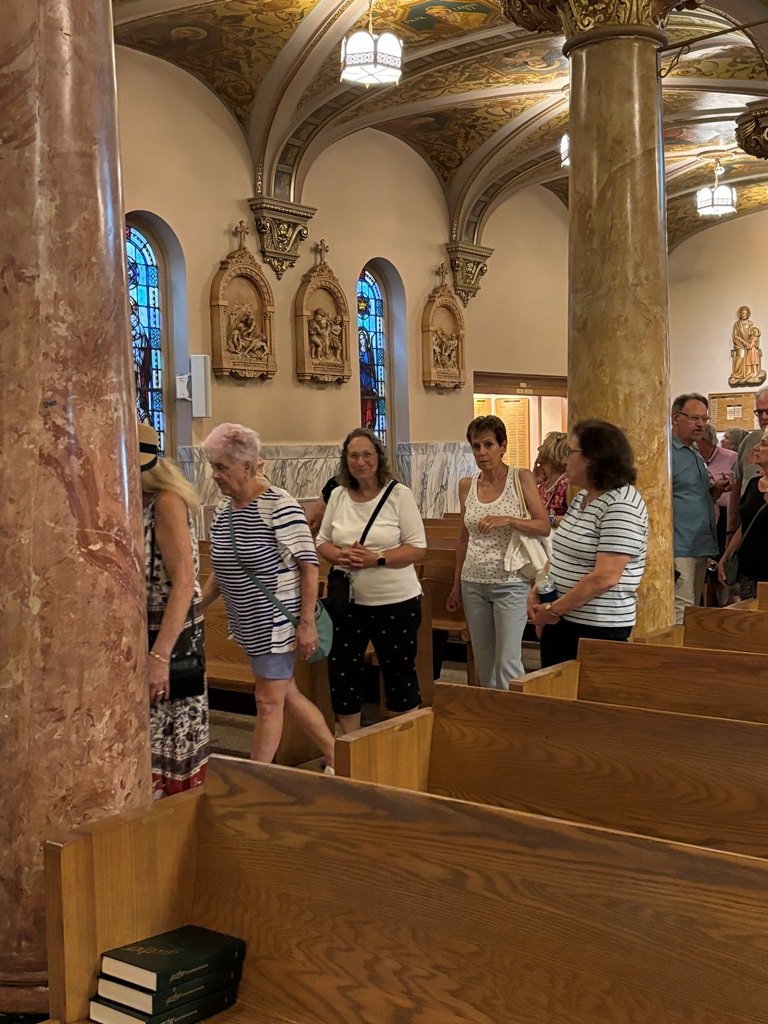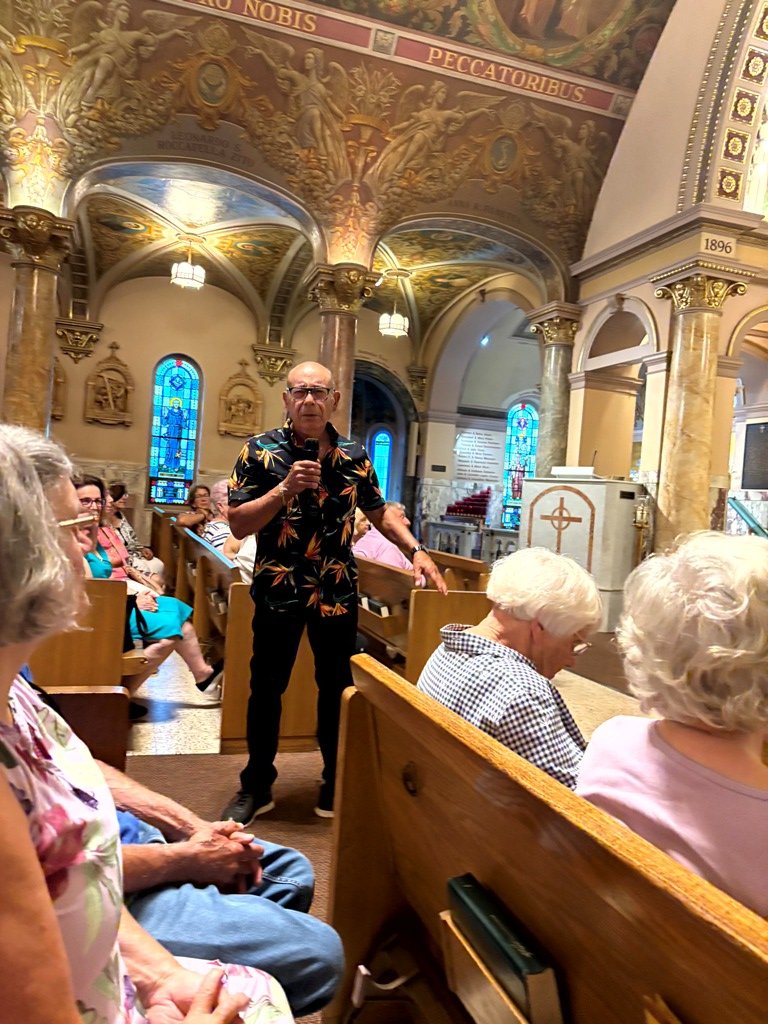 About 50 people attended the Landmarks Society of Greater Utica’s lecture and walking tour of our parish on Monday, July 28. Our own Fred Valentini led the tour explaining the history of the parish from its roots in 1896, to the beautiful paintings, to how the parish emerged over the years. Fred provided these photos.