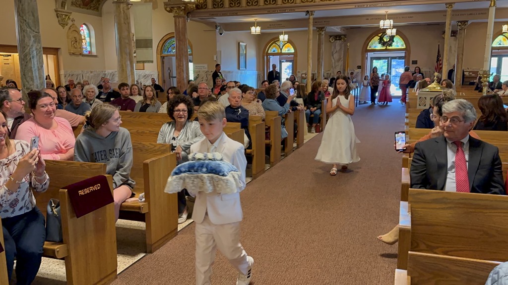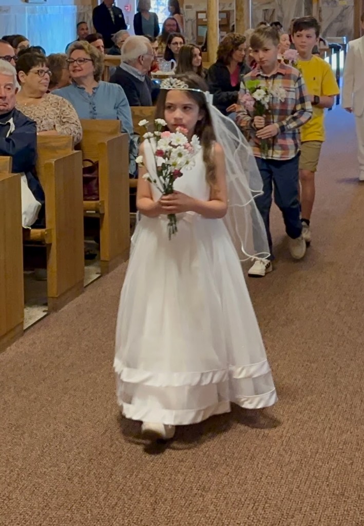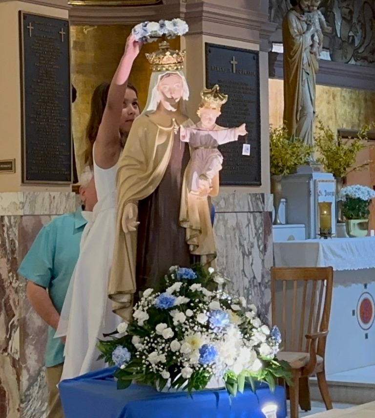 At the 4:30 p.m. Mass on Saturday, May 13, and the 10:30 a.m. Sunday Mass on May 14, the First Communion children participated in the annual May Crowning. Photos from the 4:30 ceremony are courtesy of Terri Panuccio.